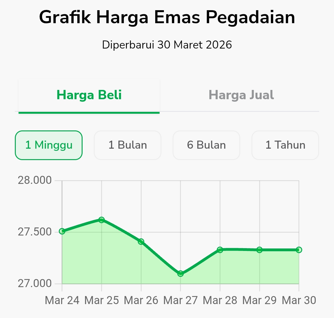 Pada 24 Maret 2026, harga berada di kisaran Rp27.500, kemudian naik ke Rp27.600 pada 25 Maret. Namun tren tersebut tidak berlangsung lama, karena harga kembali turun hingga menyentuh sekitar Rp27.100 pada 27 Maret.