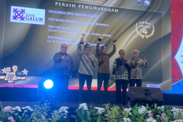 lintaspriangan.com, BERITA CIAMIS. Kabar membanggakan datang dari BPR Galuh Ciamis. Untuk pertama kalinya sejak berdiri, bank milik daerah ini berhasil meraih tiga penghargaan Bintang 4, sekaligus mendapatkan 3 kategori yaitu Top BUMD Awards 2026, Top CEO BUMD 2026, Usman Ependi,S.Kom, Direktur Utama dan Top Pembina BUMD 2026, Dr H Herdiat Sunarya, Bupati Ciamis.